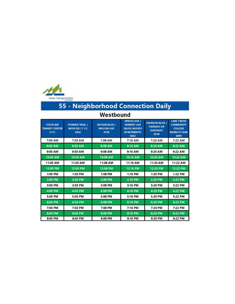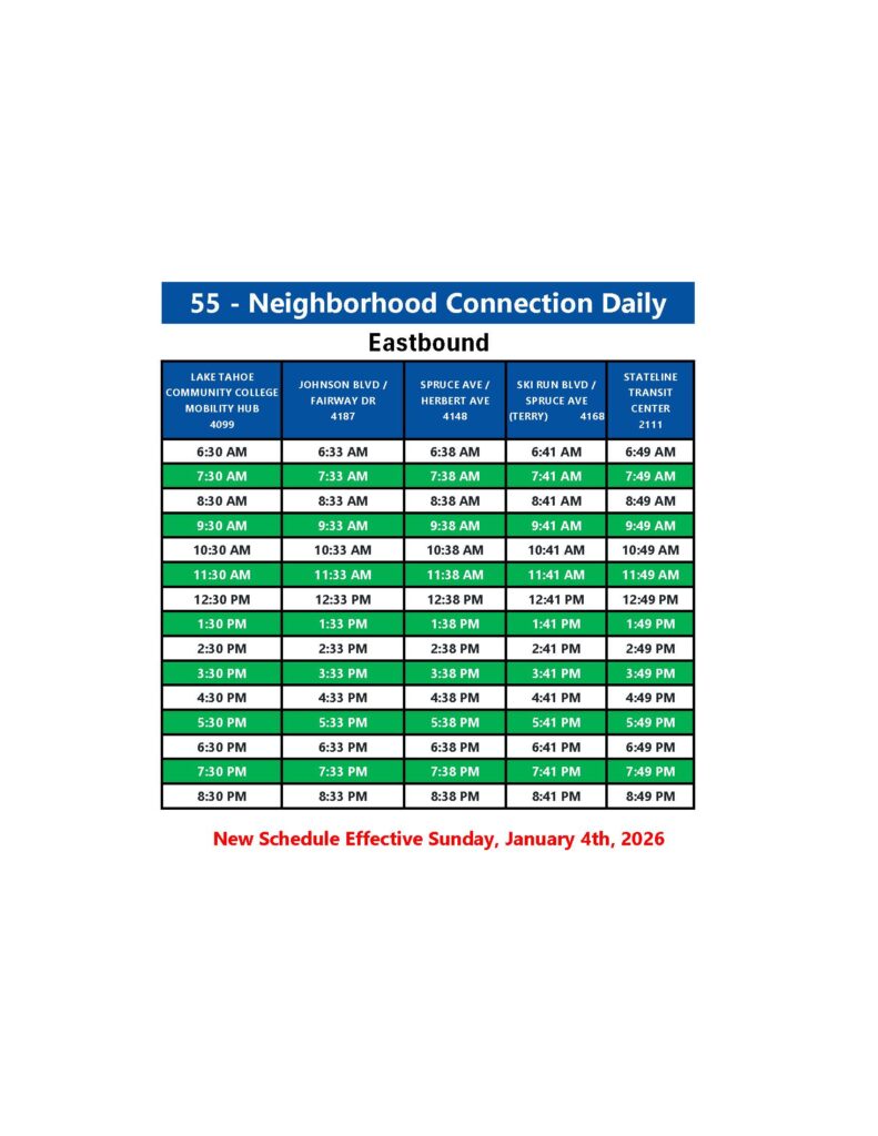 Eastbound service for Route 55 will begin at Lake Tahoe Community College (LTCC) and end at the Stateline Transit Center (STC), where a layover will take place and riders can transfer to Route 50 eastbound to Kingsbury Transit Center (KTC).