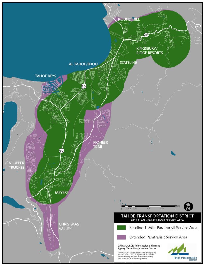 Paratransit is offered within one mile of fixed routes, and also to Kingsbury Grade within the Baseline Service Area.